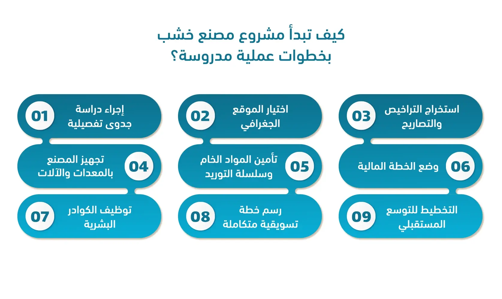 لبدء مشروع مصنع خشب بخطوات عملية ومدروسة، من المهم اتباع مجموعة من الخطوات الأساسية التي تضمن تنفيذ المشروع بشكل جيد يساهم في نجاح على المدى القريب والبعيد، ومن أهم تلك الخطوات ما يلي:
